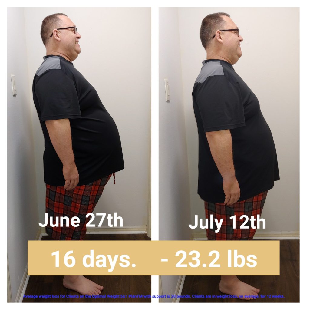 At the end of our week 2, Andrew lost another 5.4 lbs which brought his total weight loss to 23.2 lbs, and I lost 2.8 lbs bringing my total weight loss to 8.4 lbs. We were both excited to see the weight come off. We took some more photos, and we were surprised that you could see the difference in just two weeks. Seeing these pictures help to reinforce that we are on the right path to getting healthy.