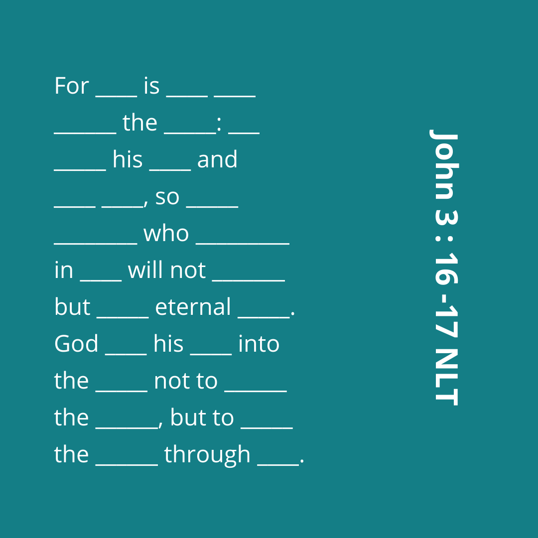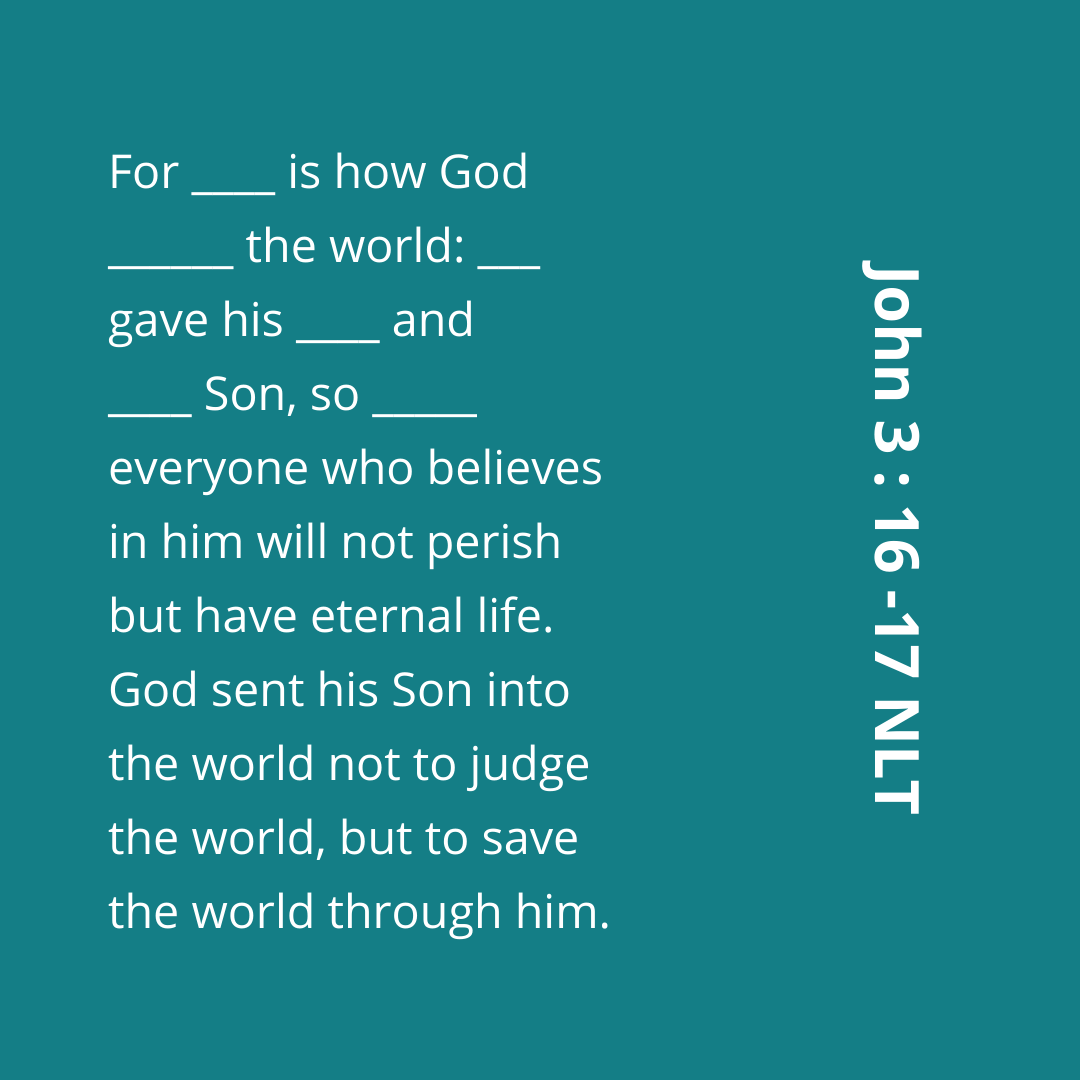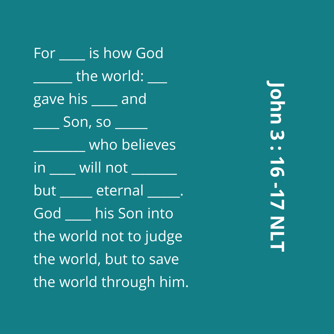 You may be familiar with John 3:16 and most likely already know it by heart! But what about John 3:17?? Let’s memorized these verses this week as they are the true foundation of our faith!