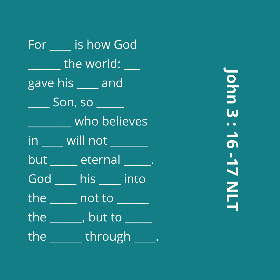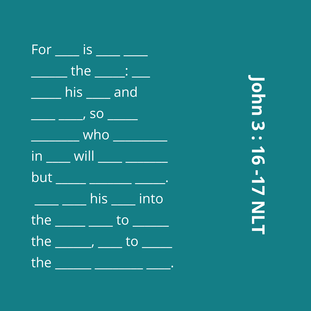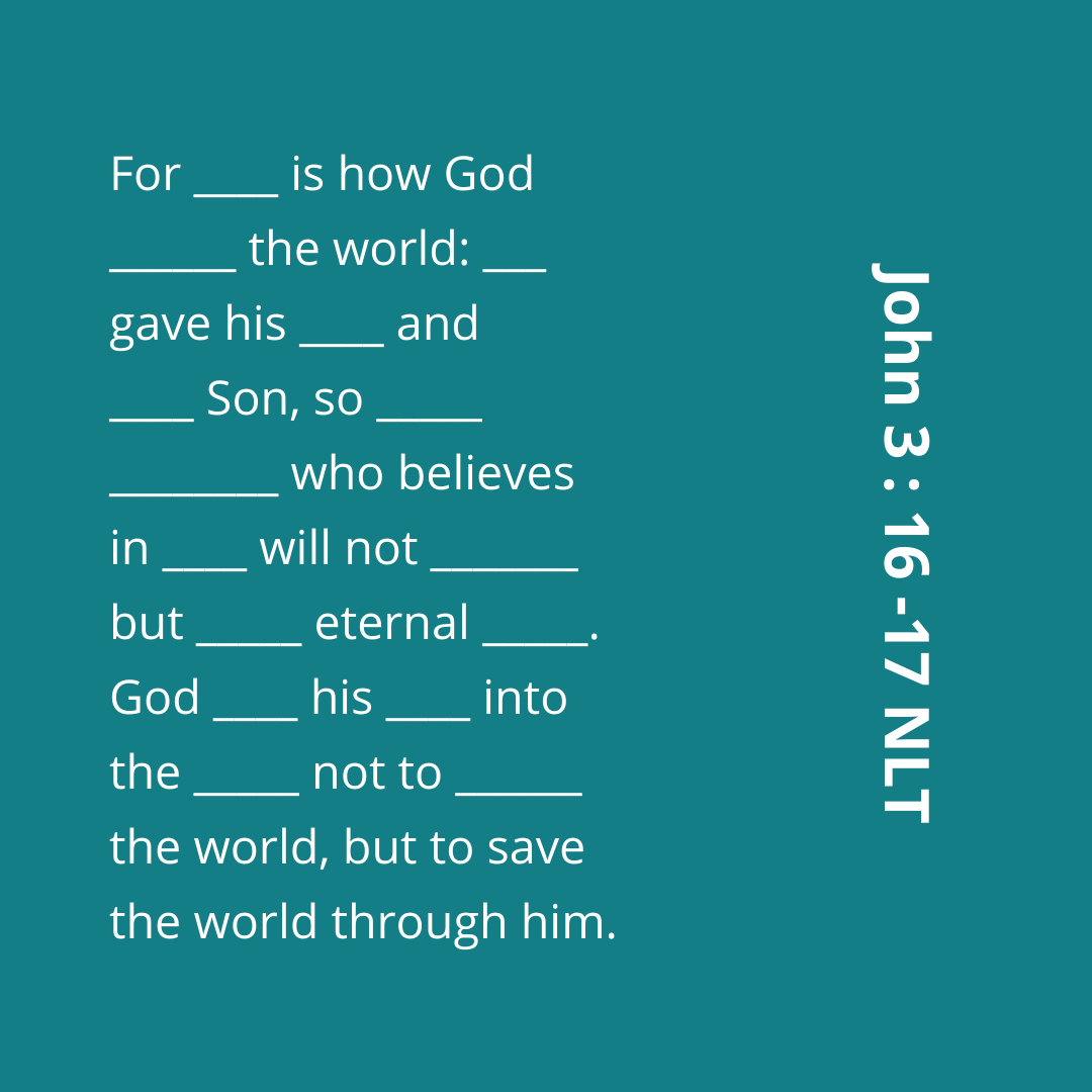 You may be familiar with John 3:16 and most likely already know it by heart! But what about John 3:17?? Let’s memorized these verses this week as they are the true foundation of our faith!
