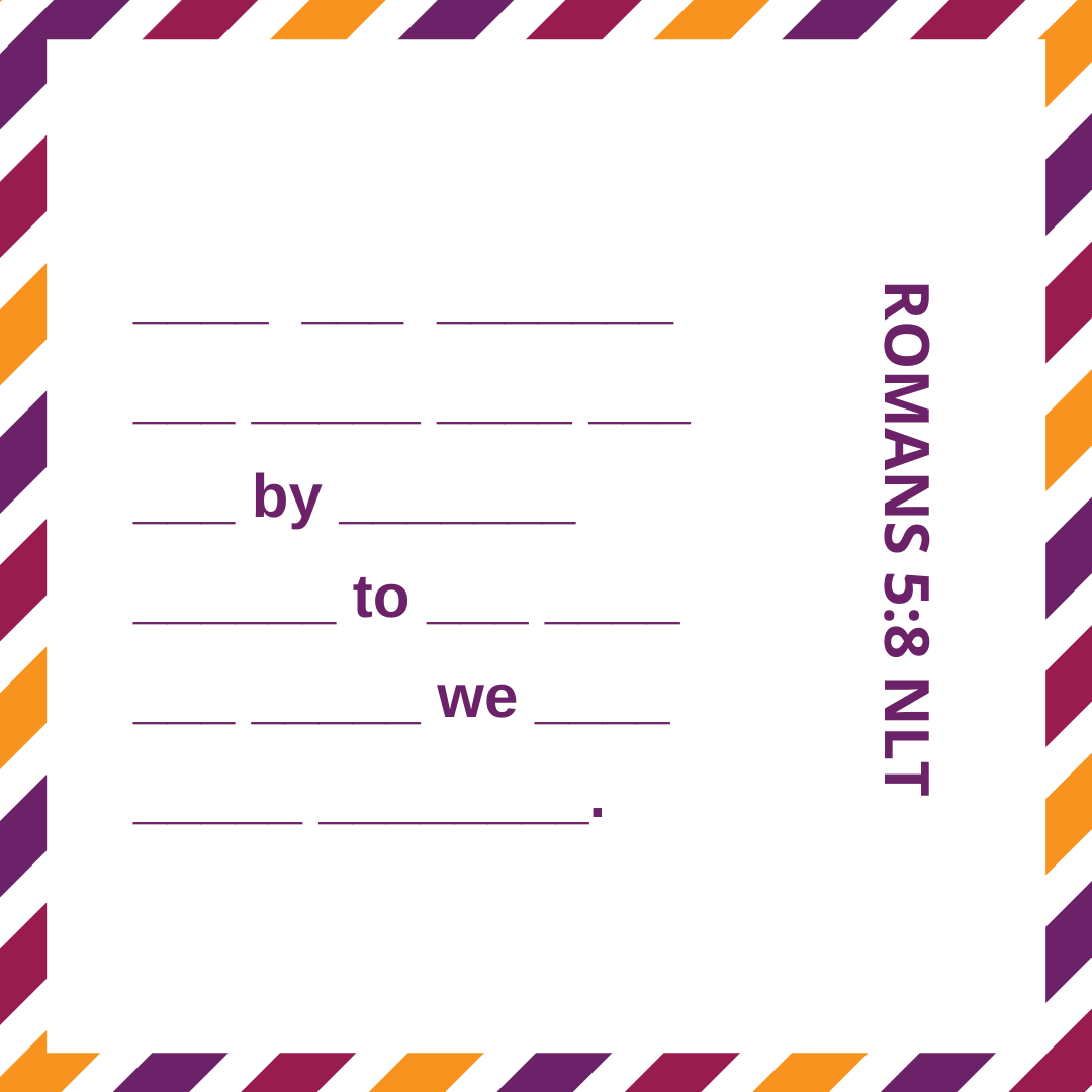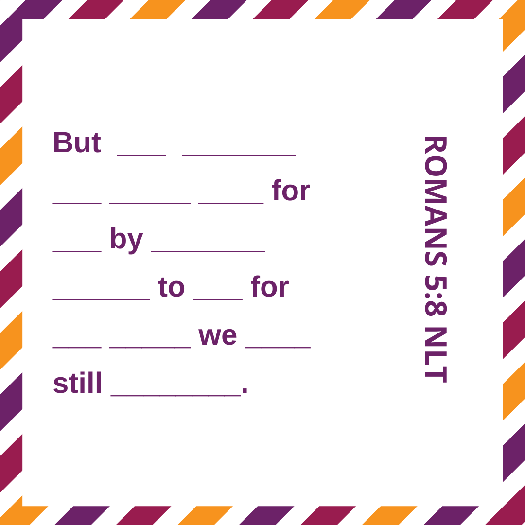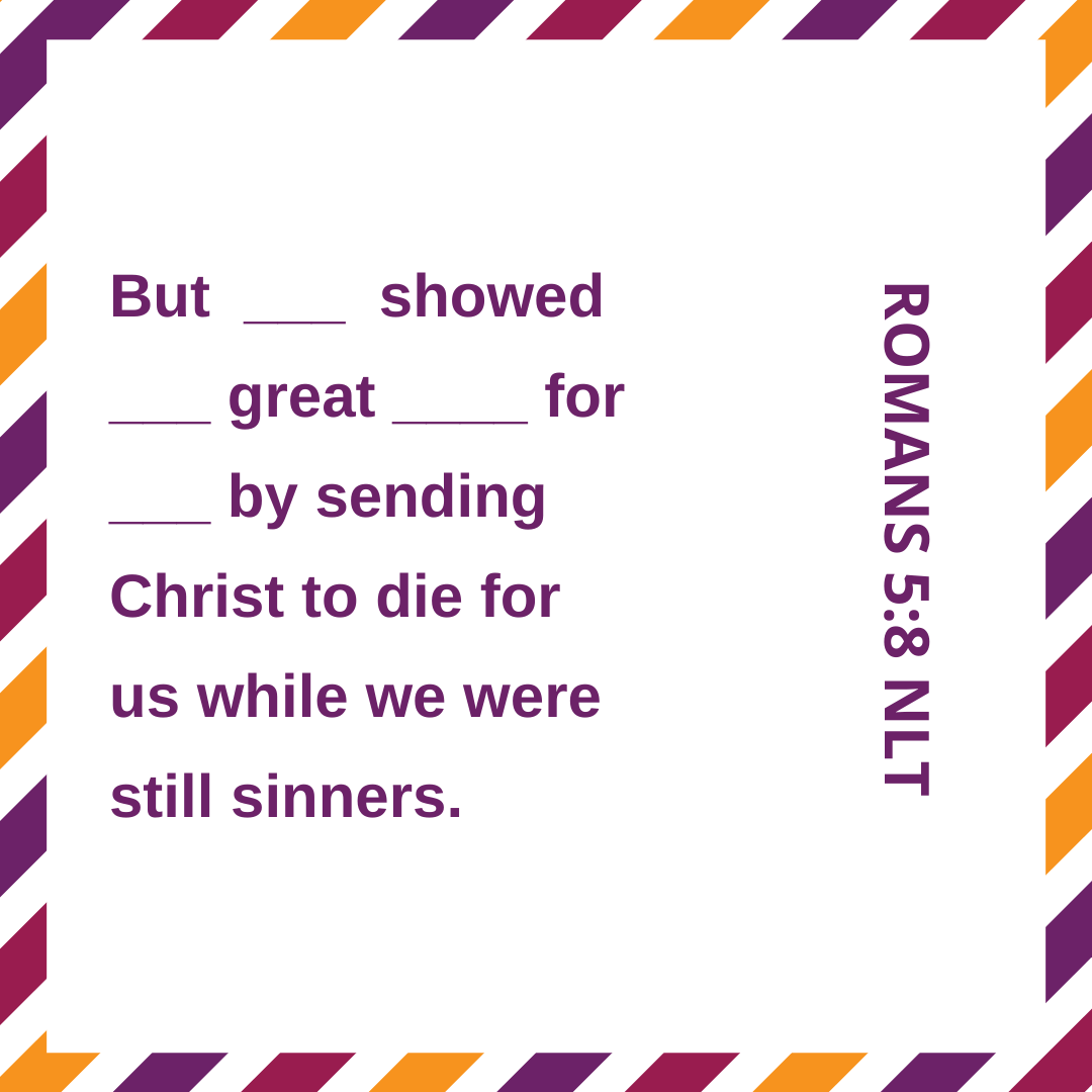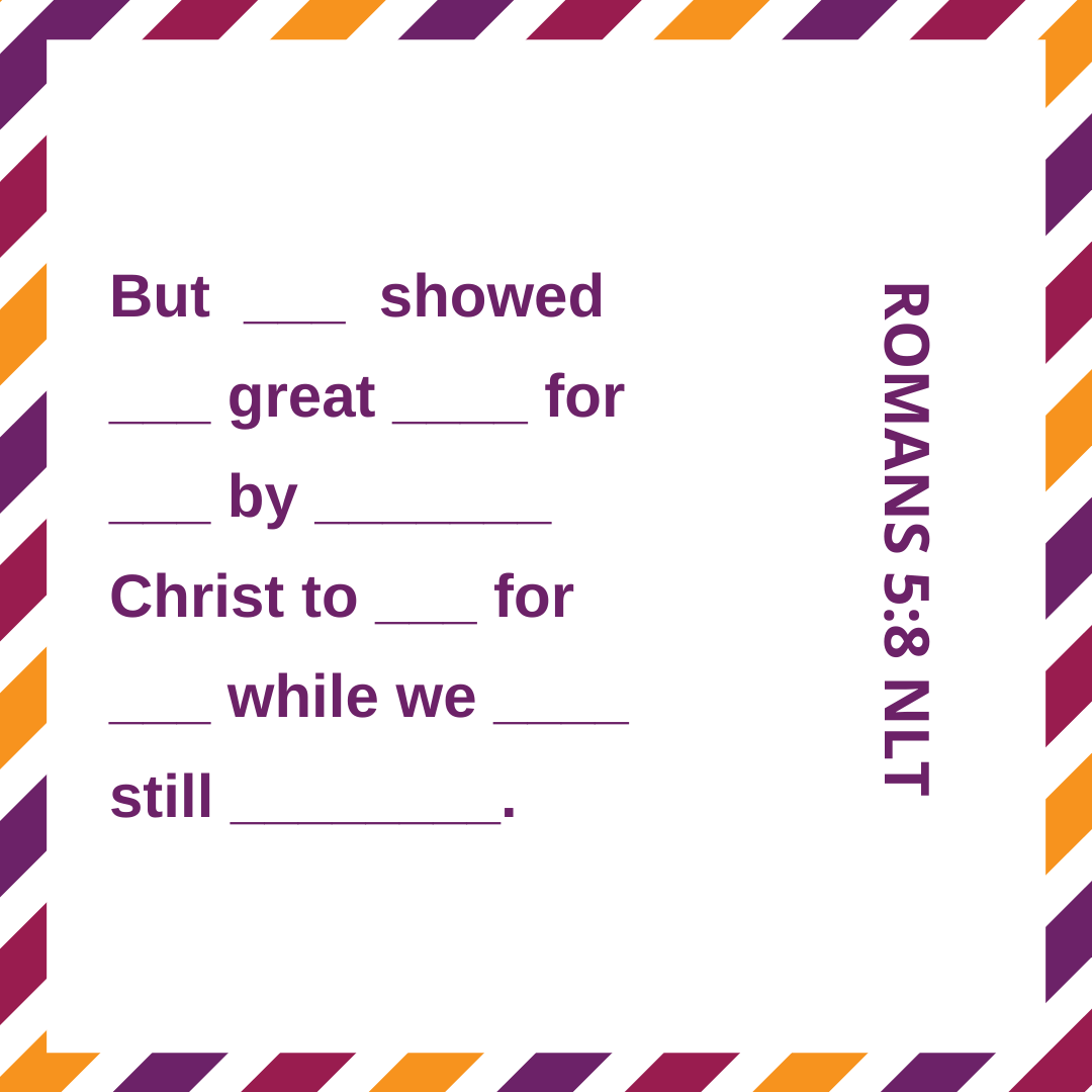 Our scripture this week to memorize is ๐—ฅ๐—ผ๐—บ๐—ฎ๐—ป๐˜€ ๐Ÿฑ:๐Ÿด.
